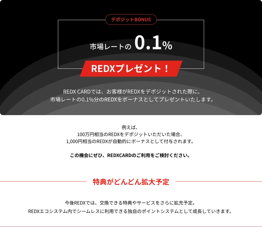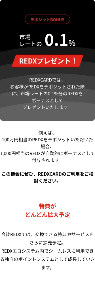 ウォレット不要、取引所を介さず、シンプルかつ安心して使えるREDX CARDで、より自由な資産運用と新しい決済体験を提供します。